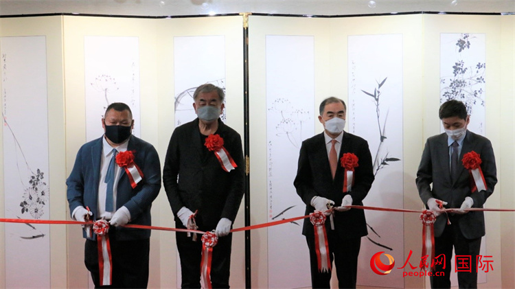 图为中国驻日本大使孔铉佑(右二)、日本著名建筑设计师隈研吾(左二)、旅日知名画家王传峰(左一)等为开幕式剪彩。人民网 吴颖摄